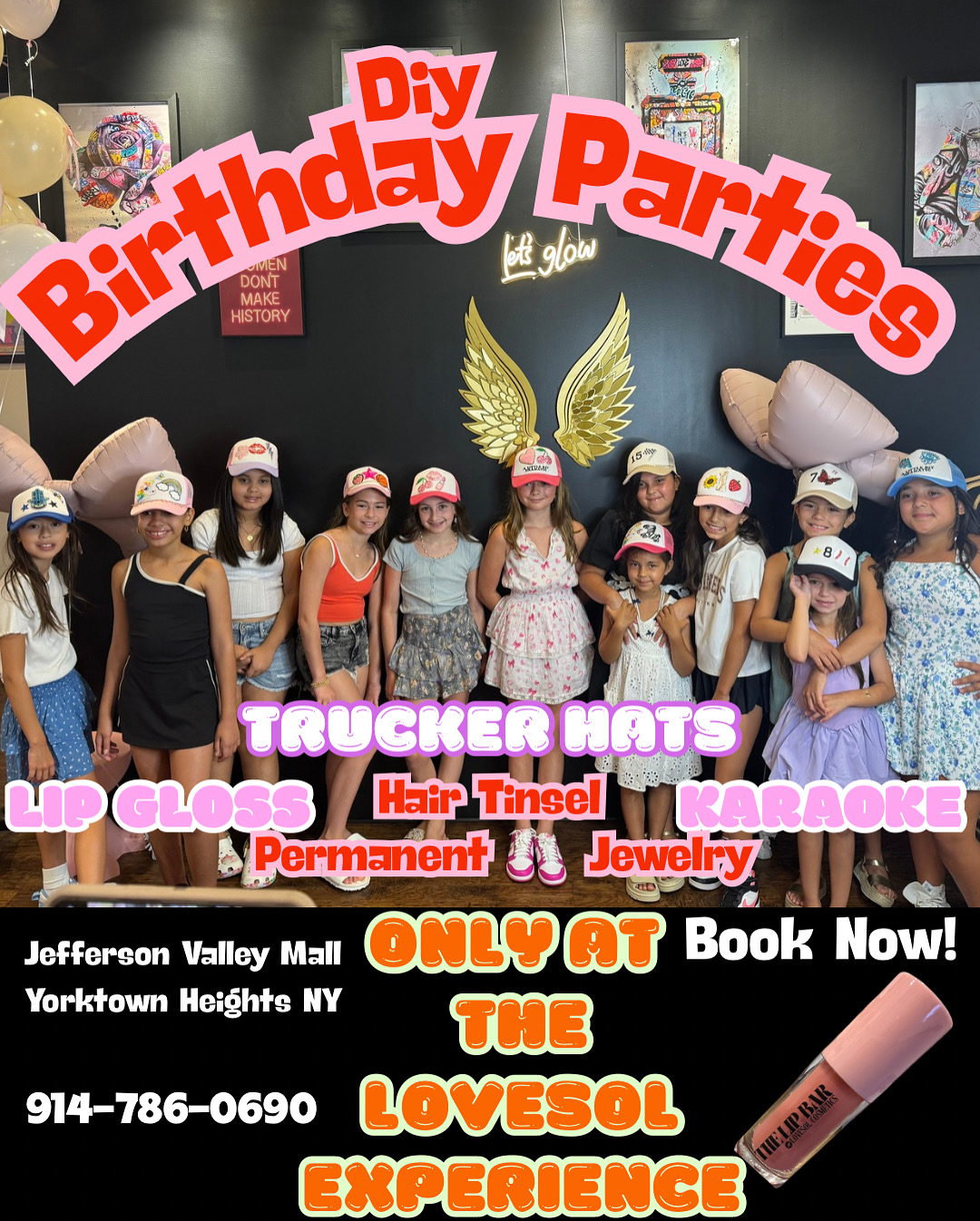 $549 for up to 10 kids (ages 6-15), $30 per additional child (max 20-24 total). Includes 2-2.5 hours of fun: DIY lip gloss making, sparkle tattoos, karaoke, 2 pizza pies & unlimited juice! Add-ons available: tinsel hair, custom trucker hat bar ($5 off per hat when added to lip gloss party), or fanny packs. You can also book a trucker hat/fanny pack party separately. $150 non-refundable deposit required. We're the ONLY place in the area offering this unique experience!
